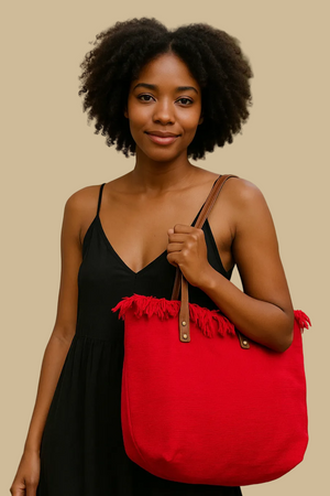 Make a bold statement with the Scarlet Fringe Red Canvas Tote Bag. Crafted from durable canvas, this vibrant red tote features eye-catching fringe details that add a playful touch to your everyday look. Spacious and sturdy, it’s perfect for carrying your essentials in style, whether you’re heading to work, the market, or a weekend outing. Elevate your accessory game with this unique and practical tote that combines fashion and function effortlessly.