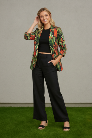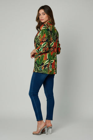 Let your style speak volumes in our Jungle Muse Blazer - where exotic charm meets everyday ease. Wrapped in a vivid tropical print of lush green palms, fiery orange florals, and botanical vibrance, this blazer is your new go-to statement piece. Designed for the free spirit with a flair for fashion, its open-front silhouette and relaxed yet tailored fit make it a versatile layering essential. Whether you're sipping cocktails poolside, heading to a creative meeting, or elevating a jeans-and-tee moment, this longline blazer delivers maximum impact with minimal effort.
