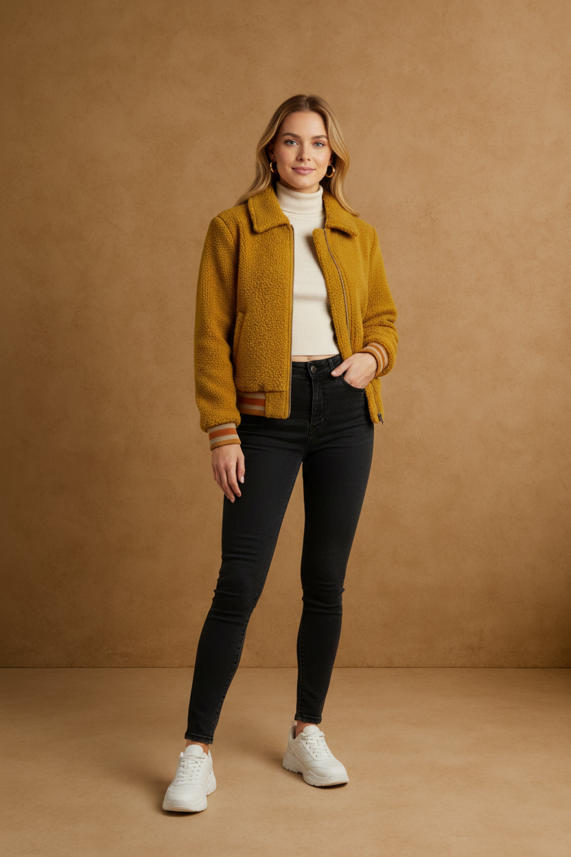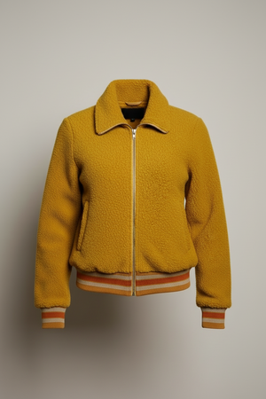 Stay warm and stylish with the Retro Honey Sherpa Bomber Jacket, featuring a cozy sherpa lining and a classic bomber silhouette. Its vintage-inspired honey color adds a timeless touch, while the durable outer shell ensures lasting wear. Perfect for chilly days, this jacket combines comfort and retro charm for effortless everyday cool