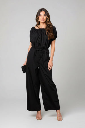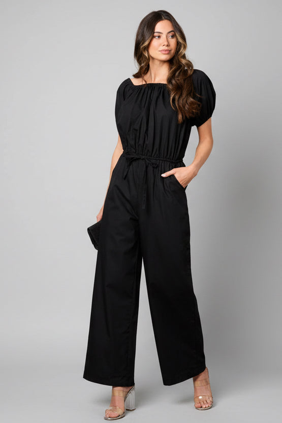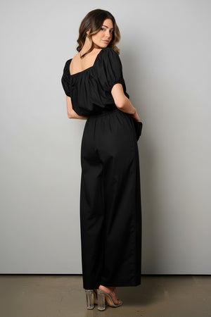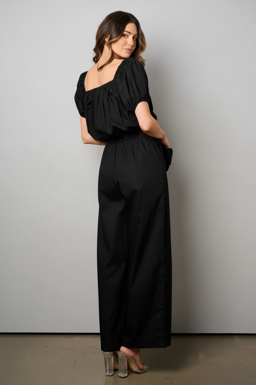 MIDNIGHT CLINCH PUFF SLEEVE ELASTIC WAIST WIDE LEG JUMPSUIT