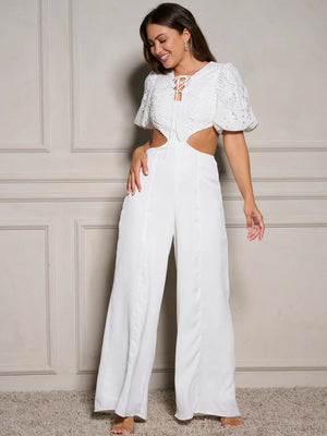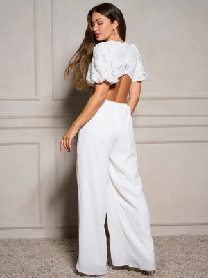 LUNA LUXE EMBROIDERED WHIRE PUFF SLEEVE V-NECK CUT OUT WIDE LEG JUMPSUIT