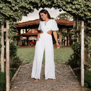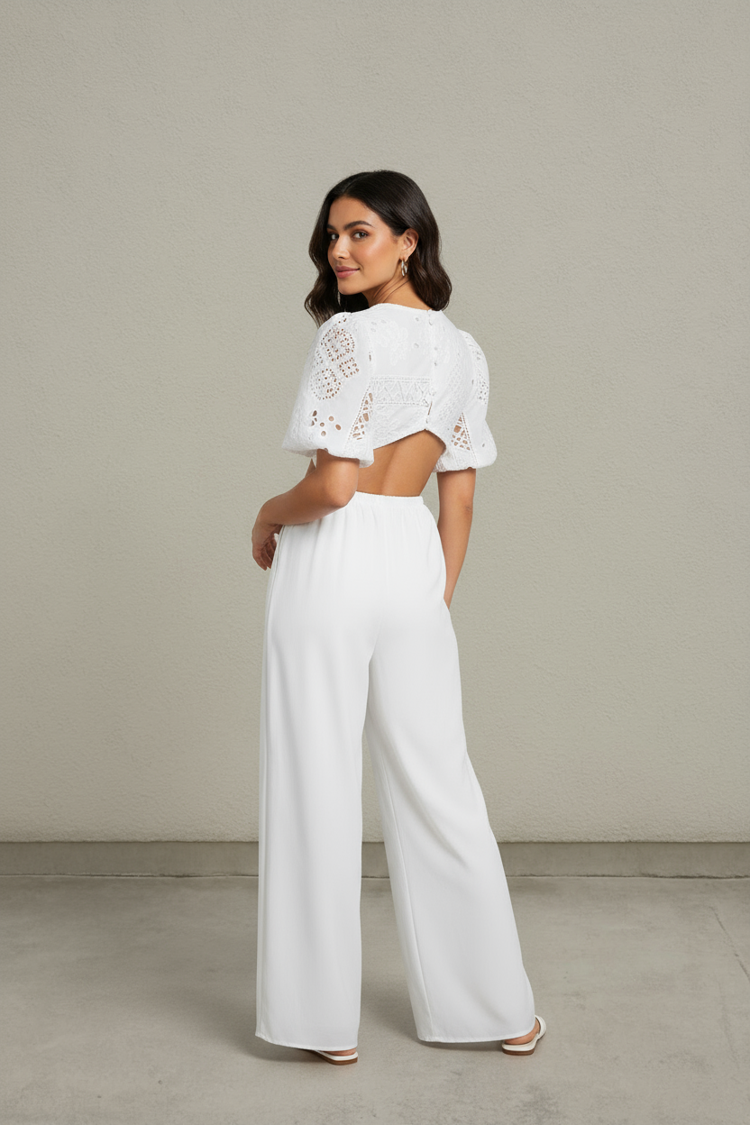 Elevate your wardrobe with the Luna Luxe Embroidered White Jumpsuit, featuring elegant puff sleeves and a flattering V-neckline. The subtle cut-out detail adds a modern touch, while the wide-leg silhouette ensures comfort and graceful movement. Perfect for sophisticated occasions, this jumpsuit combines timeless embroidery with contemporary design for a refined, standout look.