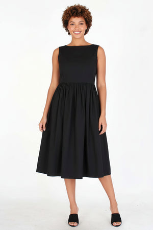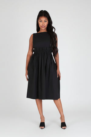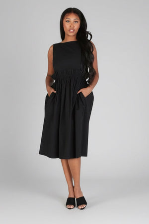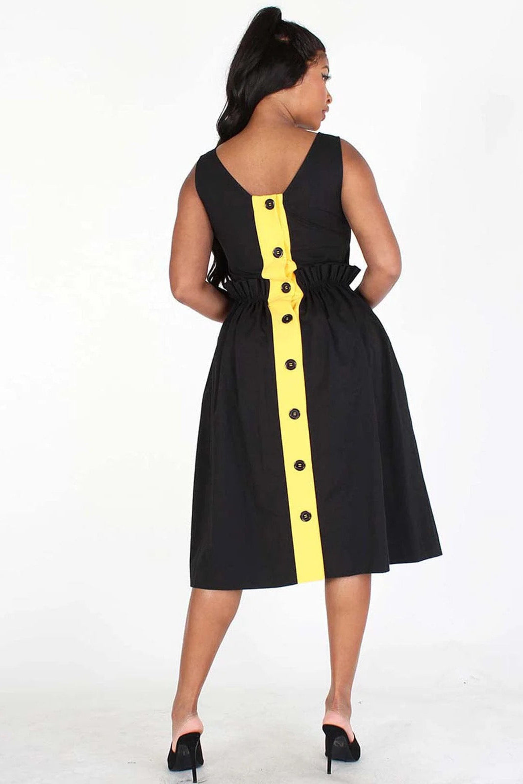 BACK BUTTON UP POCKETS FIT & FLARE SLEEVELESS MIDI DRESS