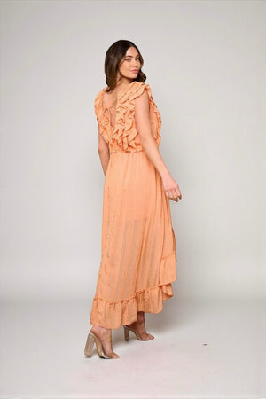 Introducing our Sleeveless Ruffle Front High-Low Midi Dress, a chic wardrobe addition! Perfect for any occasion, it features a flattering high-low hem and elegant ruffles. Crafted for the modern woman, it combines style and comfort effortlessly. Ideal for day or night, this versatile piece embodies Mandalay And Company's sophistication. Step out confidently in this must-have dress! 85% Viscose 15% Nylon Lining: 100% Rayon.