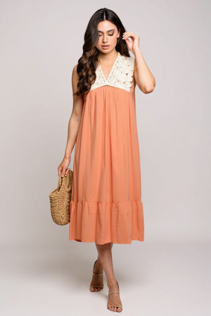 Elevate your wardrobe with our Sleeveless V-Neck Tunic Crochet Trimmed Midi Dress, blending elegance and comfort. Mandalay And Company values style and quality, offering chic pieces. This dress features a flattering V-neckline and crochet trim for any occasion. Enjoy breathable, lightweight fabric for all-day wear. Shop now and embrace the craftsmanship and timeless design of Mandalay And Company.