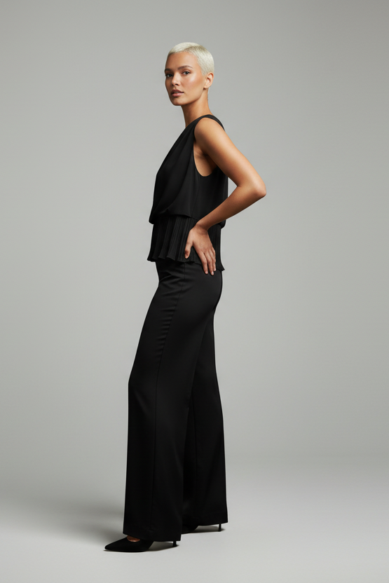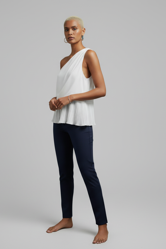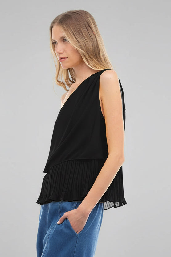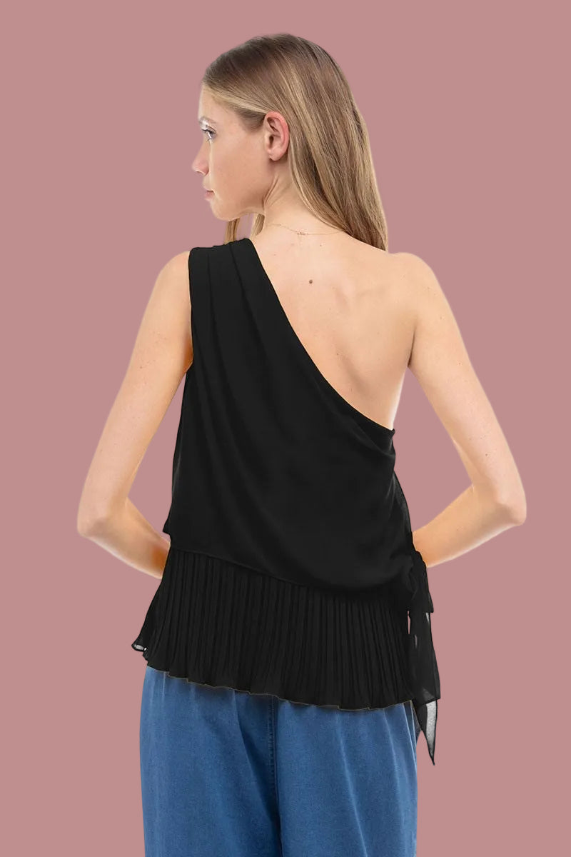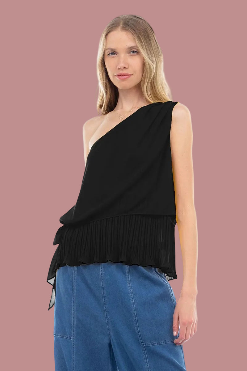 One Shoulder Pleated Top with Tie Detail Elegant pleating and a single-shoulder neckline finished with a soft tie accent. Structured yet flowy perfect for pairing with tailored pants or sleek skirts.