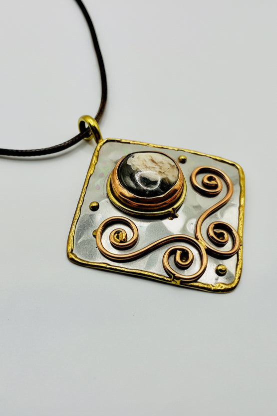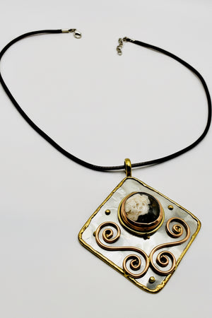 Stainless Steel Mix Metal Brown Cream Gemstone Pendant Brass/ Copper with Leather Cord