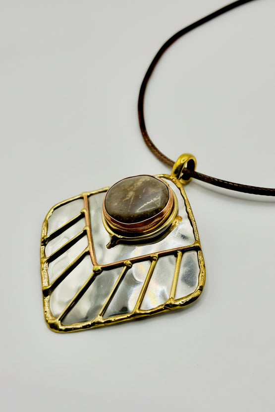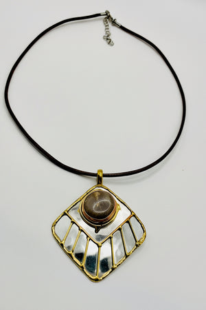 Stainless Steel Mix Metal Brown Cream Gemstone Pendant Brass/ Copper with Leather Cord