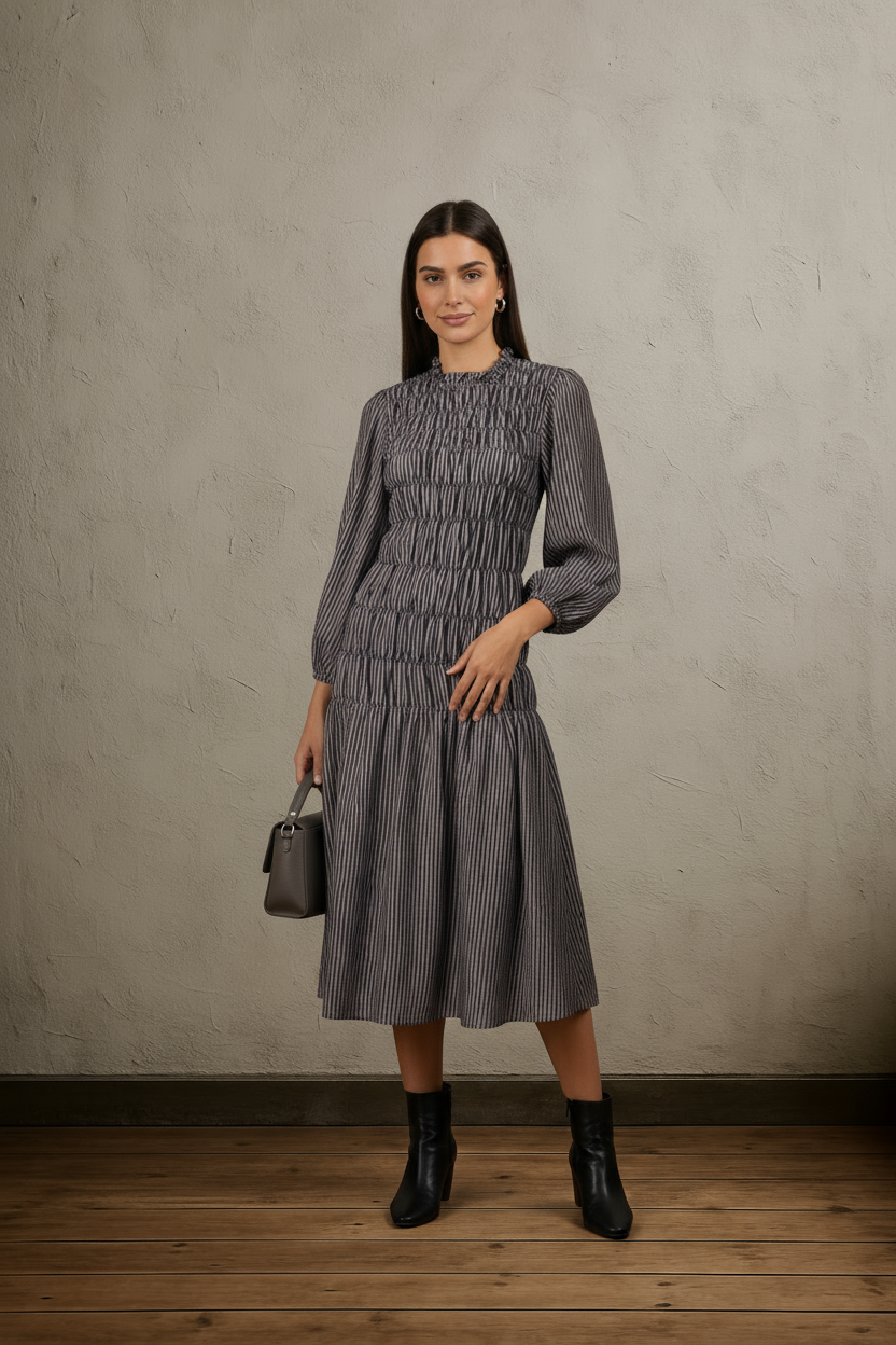 Step out in confidence with the Strut in Stripes Midi Dress. Its sleek silhouette and classic stripes create a polished look that flatters every shape. Designed for both comfort and style, this dress easily adapts from daytime meetings to evening events. Elevate your wardrobe with a versatile piece that promises to turn heads and keep you feeling empowered all day long.