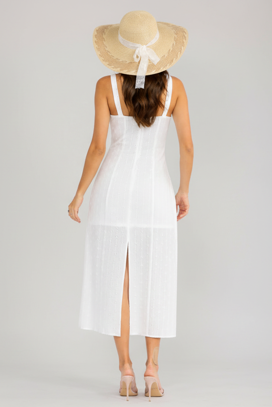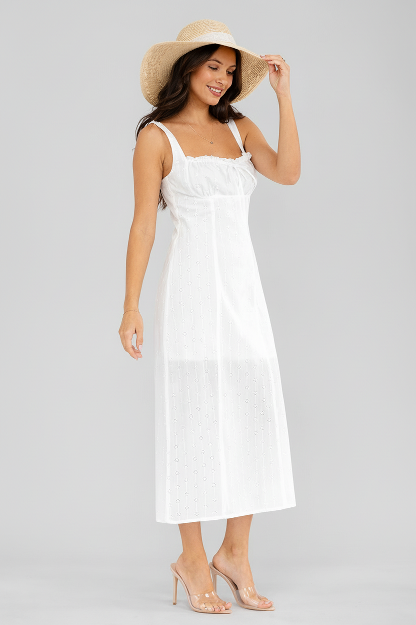 100% cotton construction, sleeveless maxi silhouette, detailed eyelet accents, hand-washable for easy care, lightweight and breathable fabric, versatile for casual or special occasions.