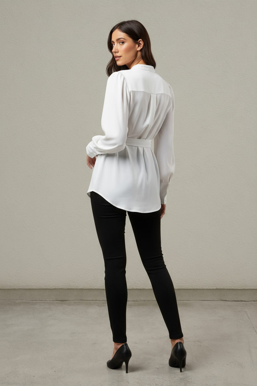 The Wrap & Go Self Belt Mandarin Collar Shirt combines timeless elegance with modern ease. Its sleek mandarin collar and adjustable self-tie belt create a tailored silhouette that enhances your natural shape. Crafted for both comfort and style, this shirt transitions seamlessly from professional environments to refined casual occasions, making it a versatile addition to any sophisticated wardrobe.