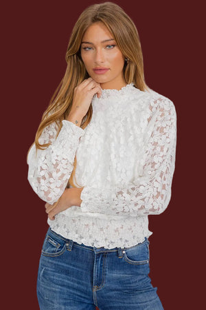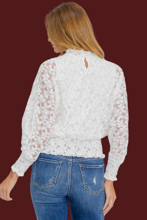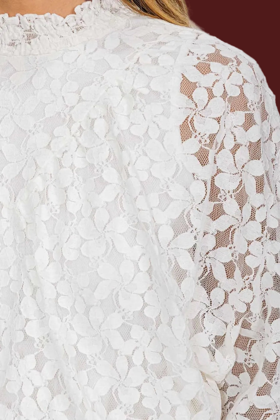 Delicate lace detailing, mock neck, flowy silhouette, versatile design